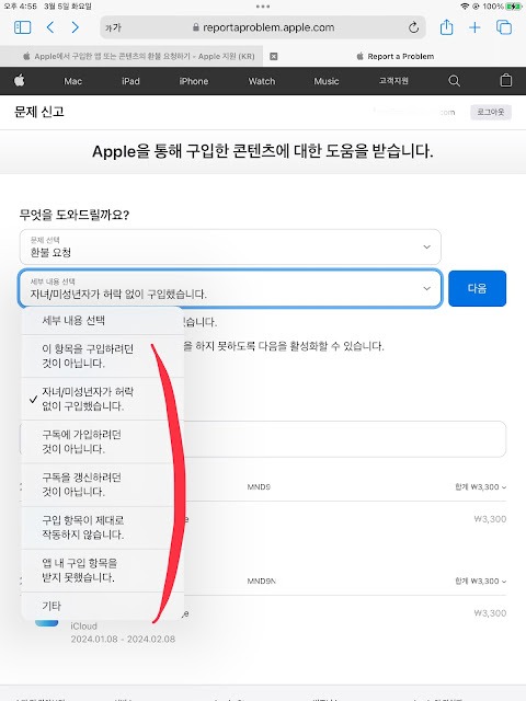 웹사이트와 마찬가지로 애플 결제 환불 사유를 고르고 설명을 적는 화면으로 넘어갑니다.