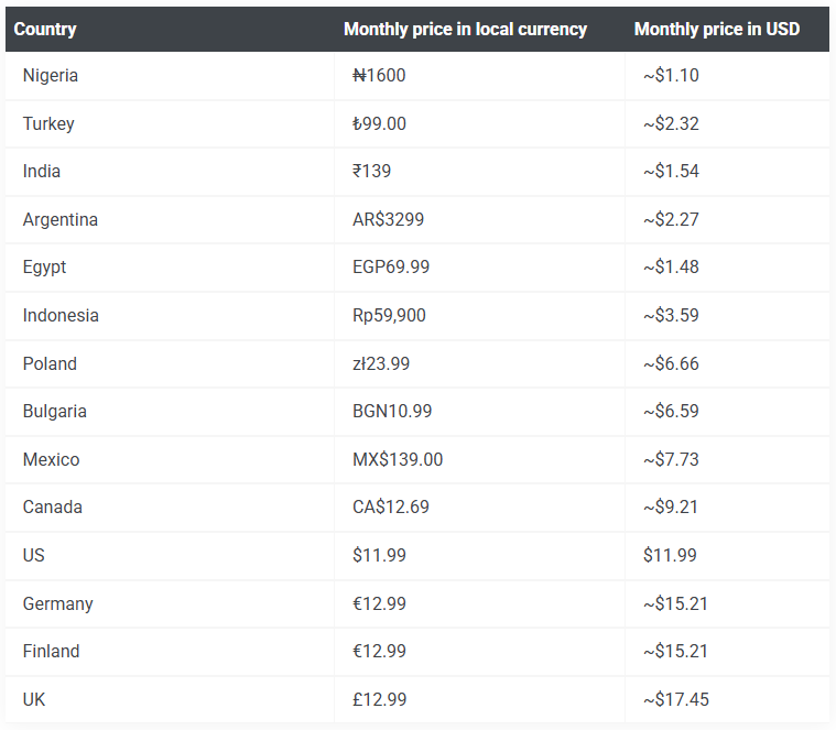 반대로 미국, 영국, 일부 유럽 국가에서는 11~19 USD로 훨씬 높은 금액을 지불해야만 이용할 수 있습니다.